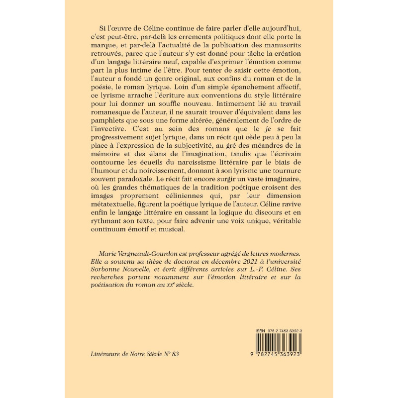 Si l’œuvre de Céline continue de faire parler d’elle aujourd’hui, c’est peut-être, par-delà les errements politiques dont elle porte la marque, et par-delà l’actualité de la publication des manuscrits retrouvés, parce que l’auteur s’y est donné pour tâche la création d’un langage littéraire neuf, capable d’exprimer l’émotion comme part la plus intime de l’être. Pour tenter de saisir cette émotion, l’auteur a fondé un genre original, aux confins du roman et de la poésie, le roman lyrique. Loin d’un simple épanchement affectif, ce lyrisme arrache l’écriture aux conventions du style littéraire pour lui donner un souffle nouveau. Intimement lié au travail romanesque de l’auteur, il ne saurait trouver d’équivalent dans les pamphlets que sous une forme altérée, généralement de l’ordre de l’invective. C’est au sein des romans que le je se fait progressivement sujet lyrique, dans un récit qui cède peu à peu la place à l’expression de la subjectivité, au gré des méandres de la mémoire et des élans de l’imagination, tandis que l’écrivain contourne les écueils du narcissisme littéraire par le biais de l’humour et du noircissement, donnant à son lyrisme une tournure souvent paradoxale. Le récit fait encore surgir un vaste imaginaire, où les grandes thématiques de la tradition poétique croisent des images proprement céliniennes qui, par leur dimension métatextuelle, figurent la poétique lyrique de l’auteur. Céline ravive enfin le langage littéraire en cassant la logique du discours et en rythmant son texte, pour faire advenir une voix unique, véritable continuum émotif et musical.