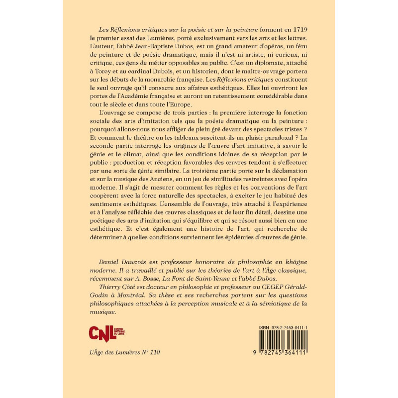 Les Réflexions critiques sur la poésie et sur la peinture forment en 1719 le premier essai des Lumières, porté exclusivement vers les arts et les lettres. L’auteur, l’abbé Jean-Baptiste Dubos, est un grand amateur d’opéras, un féru de peinture et de poésie dramatique, mais il n’est ni artiste, ni curieux, ni critique, ces gens de métier opposables au public. C’est un diplomate, attaché à Torcy et au cardinal Dubois, et un historien, dont le maître-ouvrage portera sur les débuts de la monarchie française. Les Réflexions critiques constituent le seul ouvrage qu’il consacre aux affaires esthétiques. Elles lui ouvriront les portes de l’Académie française et auront un retentissement considérable dans tout le siècle et dans toute l’Europe.