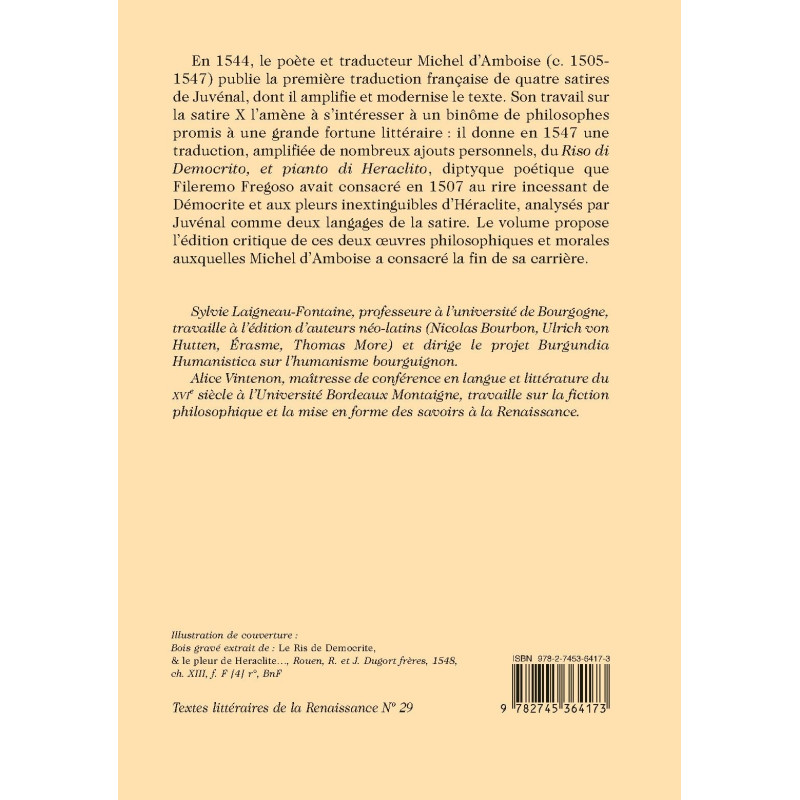 En 1544, le poète et traducteur Michel d’Amboise (c. 1505- 1547) publie la première traduction française de quatre satires de Juvénal, dont il amplifie et modernise le texte. Son travail sur la satire X l’amène à s’intéresser à un binôme de philosophes promis à une grande fortune littéraire : il donne en 1547 une traduction, amplifiée de nombreux ajouts personnels, du Riso di Democrito, et pianto di Heraclito, diptyque poétique que Fileremo Fregoso avait consacré en 1507 au rire incessant de Démocrite et aux pleurs inextinguibles d’Héraclite, analysés par Juvénal comme deux langages de la satire. Le volume propose l’édition critique de ces deux oeuvres philosophiques et morales auxquelles Michel d’Amboise a consacré la fin de sa carrière.
