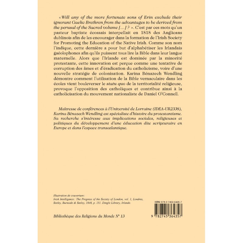 «Will any of the more fortunate sons of Erin exclude their ignorant Gaelic Brethren from the advantages to be derived from the perusal of the Sacred volume […] ? ». C’est par ces mots qu’un pasteur baptiste écossais interpellait en 1818 des Anglicans dublinois afin de les encourager dans la formation de l’Irish Society for Promoting the Education of the Native Irish. Comme son nom l’indique, cette dernière a pour but d’alphabétiser les Irlandais gaéolophones afin qu’ils puissent tous lire la Bible dans leur langue maternelle. Alors que l’Irlande est dominée par la minorité protestante, cette innovation est perçue comme une tentative de corruption des âmes et d’éradication du catholicisme, voire d’une nouvelle stratégie de colonisation. Karina Bénazech Wendling démontre comment l’utilisation de la Bible vernaculaire dans les écoles vient bouleverser le statu quo de la territorialité religieuse, provoque l’opposition des catholiques et contribue ainsi à la catholicisation du mouvement nationaliste de Daniel O’Connell.