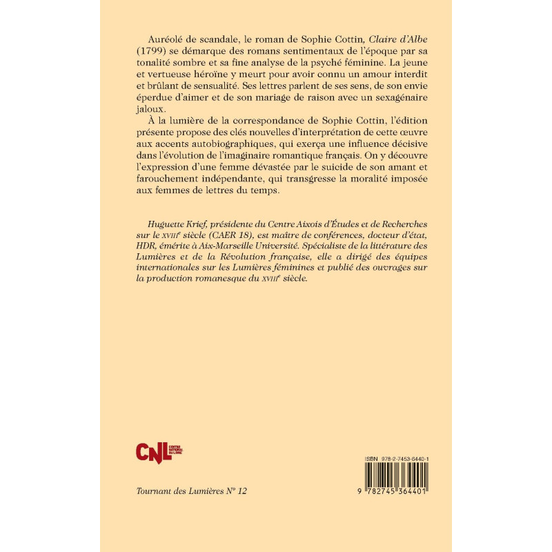 Auréolé de scandale, le roman de Sophie Cottin, Claire d’Albe (1799) se démarque des romans sentimentaux de l’époque par sa tonalité sombre et sa fine analyse de la psyché féminine. La jeune et vertueuse héroïne y meurt pour avoir connu un amour interdit et brûlant de sensualité. Ses lettres parlent de ses sens, de son envie éperdue d’aimer et de son mariage de raison avec un sexagénaire jaloux.