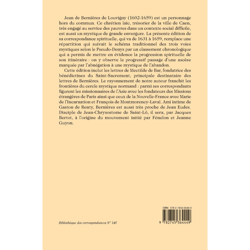 Cette édition inclut les lettres de Mectilde de Bar, fondatrice des bénédictines du Saint-Sacrement, principale destinataire des lettres de Bernières. Le rayonnement de notre auteur franchit les frontières du cercle mystique normand : parmi ses correspondants figurent les missionnaires de l’Asie avec les fondateurs des Missions étrangères de Paris ainsi que ceux de la Nouvelle-France avec Marie de l’Incarnation et François de Montmorency-Laval. Ami intime de Gaston de Renty, Bernières est aussi très proche de Jean Eudes. Disciple de Jean-Chrysostome de Saint-Lô, il sera, par Jacques Bertot, à l’origine du mouvement initié par Fénelon et Jeanne Guyon.