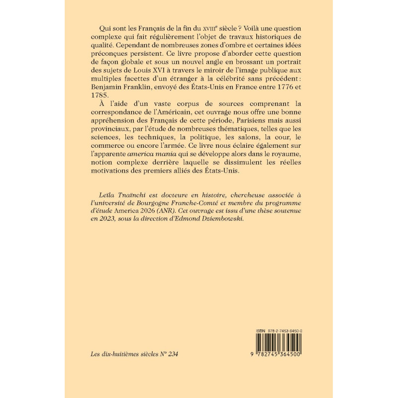 Qui sont les Français de la fin du XVIIIe siècle ? Voilà une question complexe qui fait régulièrement l’objet de travaux historiques de qualité. Cependant de nombreuses zones d’ombre et certaines idées préconçues persistent. Ce livre propose d’aborder cette question de façon globale et sous un nouvel angle en brossant un portrait des sujets de Louis XVI à travers le miroir de l’image publique aux multiples facettes d’un étranger à la célébrité sans précédent : Benjamin Franklin, envoyé des États-Unis en France entre 1776 et 1785.