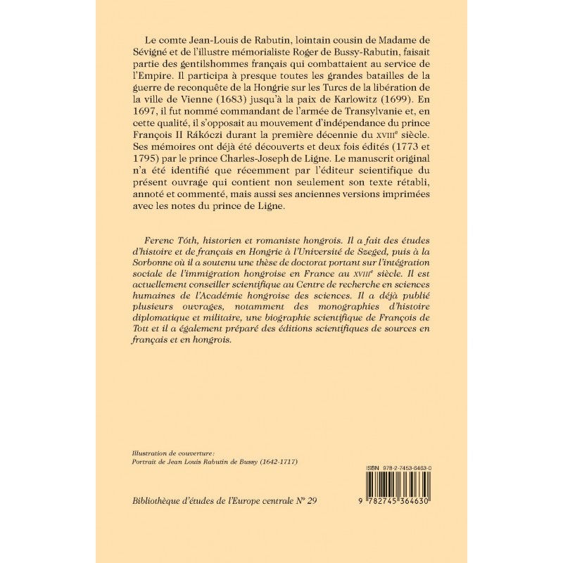 Le comte Jean-Louis de Rabutin, lointain cousin de Madame de Sévigné et de l’illustre mémorialiste Roger de Bussy-Rabutin, faisait partie des gentilshommes français qui combattaient au service de l’Empire. Il participa à presque toutes les grandes batailles de la guerre de reconquête de la Hongrie sur les Turcs de la libération de la ville de Vienne (1683) jusqu’à la paix de Karlowitz (1699). En 1697, il fut nommé commandant de l’armée de Transylvanie et, en cette qualité, il s’opposait au mouvement d’indépendance du prince François II Rákóczi durant la première décennie du XVIIIe siècle. Ses mémoires ont déjà été découverts et deux fois édités (1773 et 1795) par le prince Charles-Joseph de Ligne. Le manuscrit original n’a été identifié que récemment par l’éditeur scientifique du présent ouvrage qui contient non seulement son texte rétabli, annoté et commenté, mais aussi ses anciennes versions imprimées avec les notes du prince de Ligne.