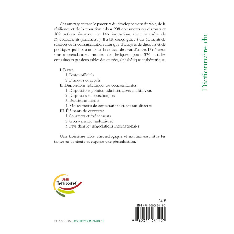 Cet ouvrage retrace le parcours du développement durable, de la résilience et de la transition : dans 208 documents ou discours et 109 actions émanant de 146 institutions dans le cadre de 39 événements (sommets...). Il a été conçu grâce à des éléments de sciences de la communication ainsi que d’analyses de discours et de politiques publics autour de la notion de mot d’ordre. D’où neuf sous-nomenclatures, munies de lexiques, pour 570 articles consultables par deux tables des entrées, alphabétique et thématique.