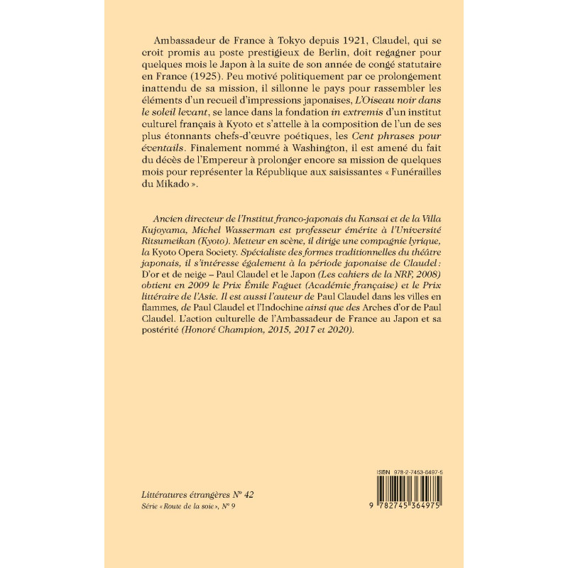 Ancien directeur de l’Institut franco-japonais du Kansai et de la Villa Kujoyama, Michel Wasserman est professeur émérite à l’Université Ritsumeikan (Kyoto). Metteur en scène, il dirige une compagnie lyrique, la Kyoto Opera Society. Spécialiste des formes traditionnelles du théâtre japonais, il s’intéresse également à la période japonaise de Claudel : D’or et de neige – Paul Claudel et le Japon (Les cahiers de la NRF, 2008) obtient en 2009 le Prix Émile Faguet (Académie française) et le Prix littéraire de l’Asie. Il est aussi l’auteur de Paul Claudel dans les villes en flammes, de Paul Claudel et l’Indochine ainsi que des Arches d’or de Paul Claudel. L’action culturelle de l’Ambassadeur de France au Japon et sa postérité (Honoré Champion, 2015, 2017 et 2020).
