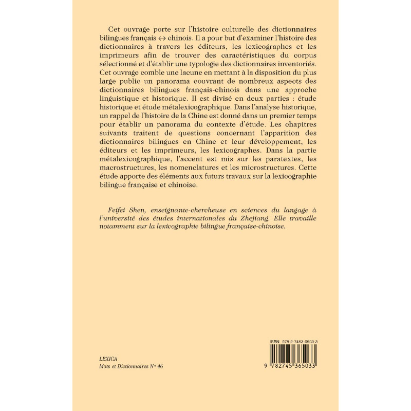 Cet ouvrage porte sur l’histoire culturelle des dictionnaires bilingues français ↔ chinois. Il a pour but d’examiner l’histoire des dictionnaires à travers les éditeurs, les lexicographes et les imprimeurs afin de trouver des caractéristiques du corpus sélectionné et d’établir une typologie des dictionnaires inventoriés. Cet ouvrage comble une lacune en mettant à la disposition du plus large public un panorama couvrant de nombreux aspects des dictionnaires bilingues français-chinois dans une approche linguistique et historique. Il est divisé en deux parties : étude historique et étude métalexicographique. Dans l’analyse historique, un rappel de l’histoire de la Chine est donné dans un premier temps pour établir un panorama du contexte d’étude. Les chapitres suivants traitent de questions concernant l’apparition des dictionnaires bilingues en Chine et leur développement, les éditeurs et les imprimeurs, les lexicographes. Dans la partie métalexicographique, l’accent est mis sur les paratextes, les macrostructures, les nomenclatures et les microstructures. Cette étude apporte des éléments aux futurs travaux sur la lexicographie bilingue française et chinoise.