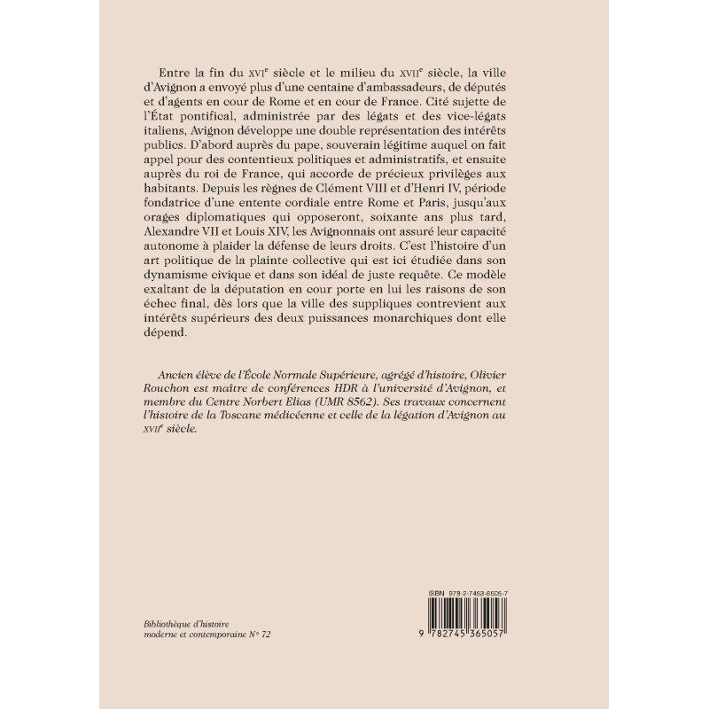 Entre la fin du XVIe siècle et le milieu du XVIIe siècle, la ville d’Avignon a envoyé plus d’une centaine d’ambassadeurs, de députés et d’agents en cour de Rome et en cour de France. Cité sujette de l’État pontifical, administrée par des légats et des vice-légats italiens, Avignon développe une double représentation des intérêts publics. D’abord auprès du pape, souverain légitime auquel on fait appel pour des contentieux politiques et administratifs, et ensuite auprès du roi de France, qui accorde de précieux privilèges aux habitants. Depuis les règnes de Clément VIII et d’Henri IV, période fondatrice d’une entente cordiale entre Rome et Paris, jusqu’aux orages diplomatiques qui opposeront, soixante ans plus tard, Alexandre VII et Louis XIV, les Avignonnais ont assuré leur capacité autonome à plaider la défense de leurs droits. C’est l’histoire d’un art politique de la plainte collective qui est ici étudiée dans son dynamisme civique et dans son idéal de juste requête. Ce modèle exaltant de la députation en cour porte en lui les raisons de son échec final, dès lors que la ville des suppliques contrevient aux intérêts supérieurs des deux puissances monarchiques dont elle dépend.