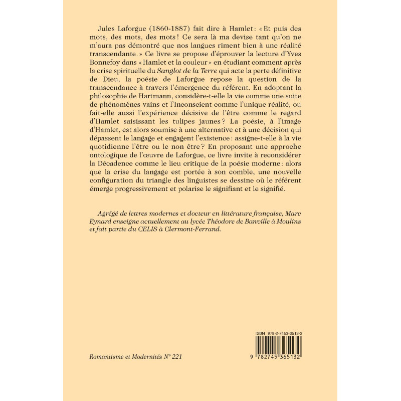 Jules Laforgue (1860-1887) fait dire à Hamlet : « Et puis des mots, des mots, des mots ! Ce sera là ma devise tant qu’on ne m’aura pas démontré que nos langues riment bien à une réalité transcendante. » Ce livre se propose d’éprouver la lecture d’Yves Bonnefoy dans « Hamlet et la couleur » en étudiant comment après la crise spirituelle du Sanglot de la Terre qui acte la perte définitive de Dieu, la poésie de Laforgue repose la question de la transcendance à travers l’émergence du référent. En adoptant la philosophie de Hartmann, considère-t-elle la vie comme une suite de phénomènes vains et l’Inconscient comme l’unique réalité, ou fait-elle aussi l’expérience décisive de l’être comme le regard d’Hamlet saisissant les tulipes jaunes ? La poésie, à l’image d’Hamlet, est alors soumise à une alternative et à une décision qui dépassent le langage et engagent l’existence : assigne-t-elle à la vie quotidienne l’être ou le non être ? En proposant une approche ontologique de l’œuvre de Laforgue, ce livre invite à reconsidérer la Décadence comme le lieu critique de la poésie moderne : alors que la crise du langage est portée à son comble, une nouvelle configuration du triangle des linguistes se dessine où le référent émerge progressivement et polarise le signifiant et le signifié.