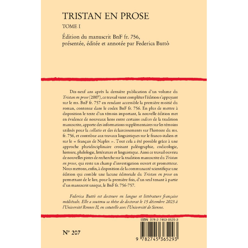 Dix-neuf ans après la dernière publication d’un volume du Tristan en prose (2007), ce travail vient compléter l’édition s’appuyant sur le ms. BnF fr. 757 en rendant accessible la première moitié du roman, contenue dans le codex BnF fr. 756. En plus de mettre à disposition le texte d’un témoin important, la nouvelle édition met en évidence de nouveaux liens entre certains codices de la tradition manuscrite, apporte des informations supplémentaires sur les témoins utilisés pour la collatio et des éclaircissements sur l’histoire du ms. fr. 756, et contribue aux travaux linguistiques sur le franco-italien et sur le « français de Naples ». Tout cela a été possible grâce à une approche pluridisciplinaire croisant paléographie, codicologie, histoire, philologie, littérature et linguistique. Ainsi ce travail ouvrira de nouvelles pistes de recherche sur la tradition manuscrite du Tristan en prose, qui reste un champ d’investigation ouvert et prometteur. Nous mettons, enfin, à disposition de la communauté scientifique une édition qui comble une lacune éditoriale du Tristan en prose en permettant de le lire, pour la première fois, d’un seul tenant à partir d’un manuscrit unique, le BnF fr. 756-757.