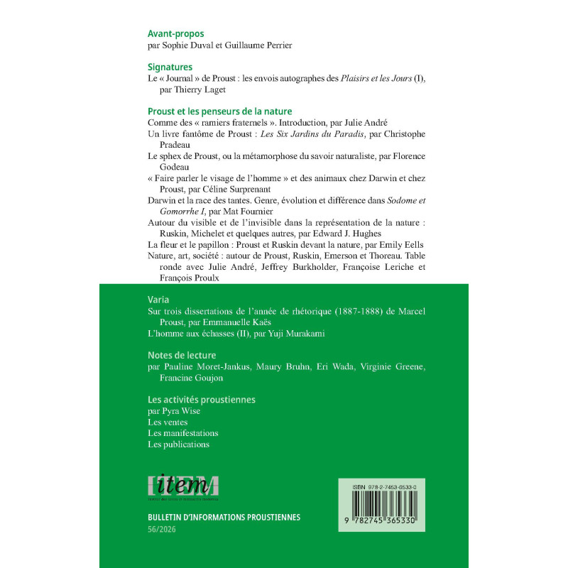 Le Bulletin d'informations proustiennes (BIP), revue placée sous la direction de Sophie Duval et Guillaume Perrier et désormais publiée aux éditions Honoré Champion, fait le point chaque année sur le travail entrepris par l’équipe Proust de l’Institut des textes et manuscrits modernes (CNRS/ENS) dans les domaines de la genèse, de l’édition et de l’interprétation de l’œuvre de Marcel Proust. La revue présente aussi régulièrement des inédits. La dernière partie du Bulletin d'informations proustiennes est consacrée aux « Notes de lecture » et à la chronique détaillée des « Ventes », « Manifestations » et « Publications » proustiennes.
