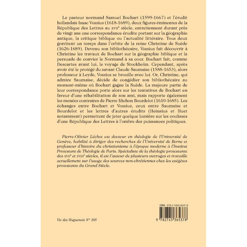 Le pasteur normand Samuel Bochart (1599-1667) et l’érudit hollandais Isaac Vossius (1618-1689), deux figures éminentes de la République des Lettres au XVIIe siècle, entretiennent durant près de vingt ans une correspondance érudite portant sur la géographie antique, la critique biblique ou l’actualité littéraire. Tous deux gravitent un temps dans l’orbite de la reine Christine de Suède (1626-1689). Devenu son bibliothécaire, Vossius fait découvrir à Christine les travaux de Bochart sur la géographie biblique et la persuade de convier le Normand à sa cour. Bochart fait, comme Descartes avant lui, le voyage de Stockholm. Cependant, après avoir été le protégé du savant Claude Saumaise (1588-1653), alors professeur à Leyde, Vossius se brouille avec lui. Or, Christine, qui admire Saumaise, décide de congédier son bibliothécaire au moment-même où Bochart gagne la Suède. La majeure partie de leur correspondance porte alors sur les tentatives de Bochart en faveur d’une réhabilitation de son ami, mais rapporte également les menées contraires de Pierre Michon Bourdelot (1610-1685). Les échanges entre Bochart et Vossius, ceux entre Saumaise et Bourdelot et les lettres d’autres érudits (Heinsius et Huet notamment) permettent de jeter quelque lumière sur les coulisses d’une République des Lettres à l’ombre des puissances politiques.