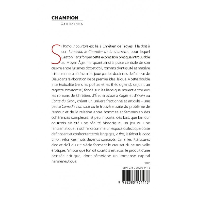 Si l’amour courtois est lié à Chrétien de Troyes, il le doit à son Lancelot, le Chevalier de la charrette, pour lequel Gaston Paris forgea cette expression presque introuvable au Moyen Âge, marquant ainsi la place centrale de son œuvre entre lyrismes d’oc et d’oïl, romans d’Antiquité et matière tristanienne, à côté du rôle joué par les doctrines de l’amour de Dieu dans l’élaboration de ce premier idéal laïque. À cette double intertextualité (vers les poètes et les théologiens), se joint un registre intratextuel, fondé sur les liens que nouent entre eux les romans de Chrétien, d’Érec et Énide à Cligès et d’Yvain au Conte du Graal, créant un univers fractionné et articulé – une petite Comédie humaine où le trouvère traite du problème de l’amour et de la relation entre hommes et femmes en des cohérences complexes. Et peu importe, dès lors, que l’amour courtois ait été une réalité historique, un jeu ou une fantasmatique : il s’offre ici comme un espace dialectique où se définissent et confrontent trois langages, la fine, la fole et la bone amor, selon ces mots devenus concepts. Car si les littératures d’oc et d’oïl du XIIe siècle forment le creuset d’une nouvelle érotique, l’amour que l’on dit courtois est aussi le produit d’une pensée critique, dont témoigne un immense capital herméneutique.