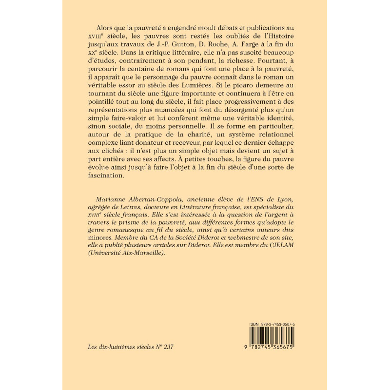 Marianne Albertan-Coppola, ancienne élève de l’ENS de Lyon, agrégée de Lettres, docteure en Littérature française, est spécialiste du XVIIIe siècle français. Elle s’est intéressée à la question de l’argent à travers le prisme de la pauvreté, aux différentes formes qu’adopte le genre romanesque au fil du siècle, ainsi qu’à certains auteurs dits minores. Membre du CA de la Société Diderot et webmestre de son site, elle a publié plusieurs articles sur Diderot. Elle est membre du CIELAM (Université Aix-Marseille).