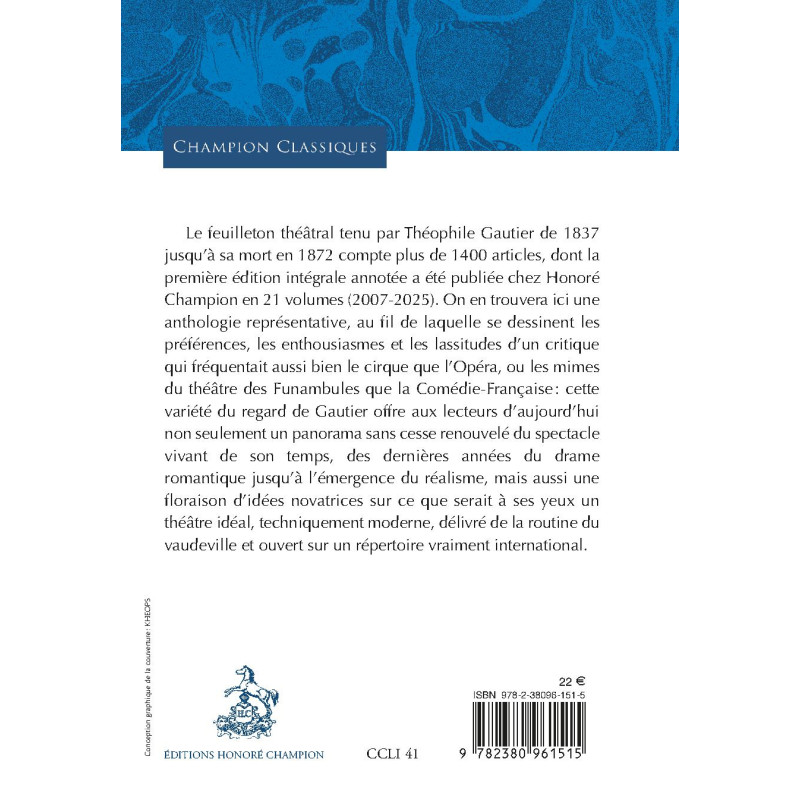 Le feuilleton théâtral tenu par Théophile Gautier de 1837 jusqu’à sa mort en 1872 compte plus de 1400 articles, dont la première édition intégrale annotée a été publiée chez Honoré Champion en 21 volumes (2007-2025). On en trouvera ici une anthologie représentative, au fil de laquelle se dessinent les préférences, les enthousiasmes et les lassitudes d’un critique qui fréquentait aussi bien le cirque que l’Opéra, ou les mimes du théâtre des Funambules que la Comédie-Française : cette variété du regard de Gautier offre aux lecteurs d’aujourd’hui non seulement un panorama sans cesse renouvelé du spectacle vivant de son temps, des dernières années du drame romantique jusqu’à l’émergence du réalisme, mais aussi une floraison d’idées novatrices sur ce que serait à ses yeux un théâtre idéal, techniquement moderne, délivré de la routine du vaudeville et ouvert sur un répertoire vraiment international.