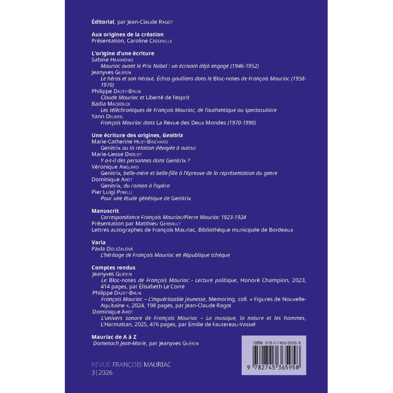 Dominique AROT : L’univers sonore de François Mauriac – La musique, la nature et les hommes, L’Harmattan, 2025, 476 pages, par Émilie de Fautereau-Vassel