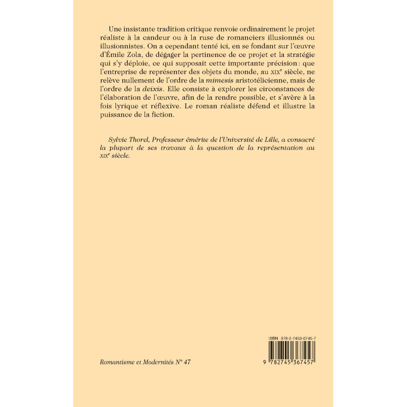 Une insistante tradition critique renvoie ordinairement le projet réaliste à la candeur ou à la ruse de romanciers illusionnés ou illusionnistes. On a cependant tenté ici, en se fondant sur l’œuvre d’Émile Zola, de dégager la pertinence de ce projet et la stratégie qui s’y déploie, ce qui supposait cette importante précision : que l’entreprise de représenter des objets du monde, au XIXe siècle, ne relève nullement de l’ordre de la mimesis aristotélicienne, mais de l’ordre de la deixis. Elle consiste à explorer les circonstances de l’élaboration de l’œuvre, afin de la rendre possible, et s’avère à la fois lyrique et réflexive. Le roman réaliste défend et illustre la puissance de la fiction.