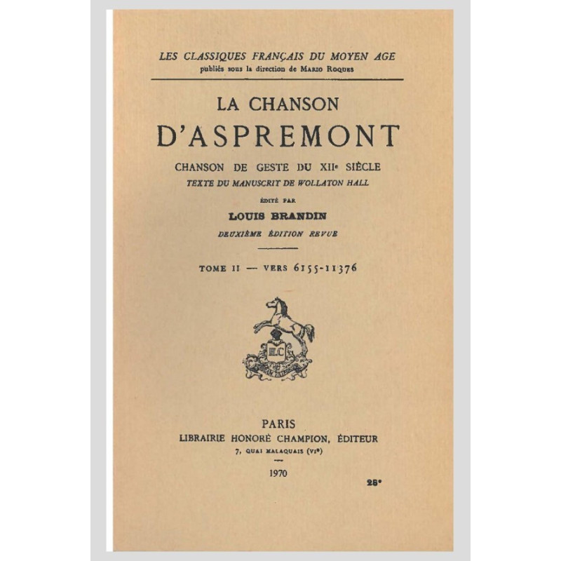 LA CHANSON D'ASPREMONT. TOME II. CHANSON DE GESTE DU XIIE SIECLE.