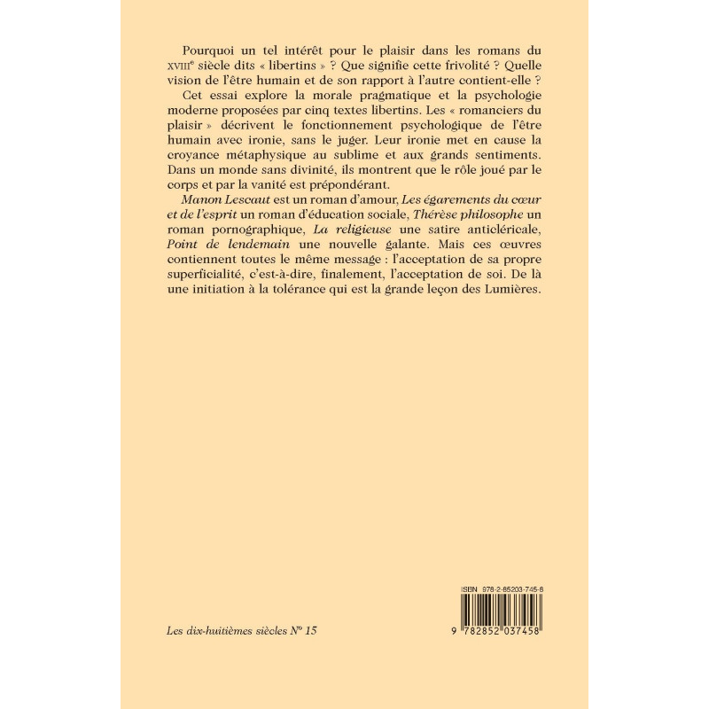 Cet essai explore la morale pragmatique et la psychologie moderne proposée par cinq textes libertins. Les "romanciers du plaisir" décrivent le fonctionnement psychologique de l'être humain avec ironie, sans le juger. Leur ironie met en cause la croyance métaphysique au sublime et aux grands sentiments. Dans un monde sans divinité, ils montrent que le rôle joué par le corps et par la vanité est prépondérant.