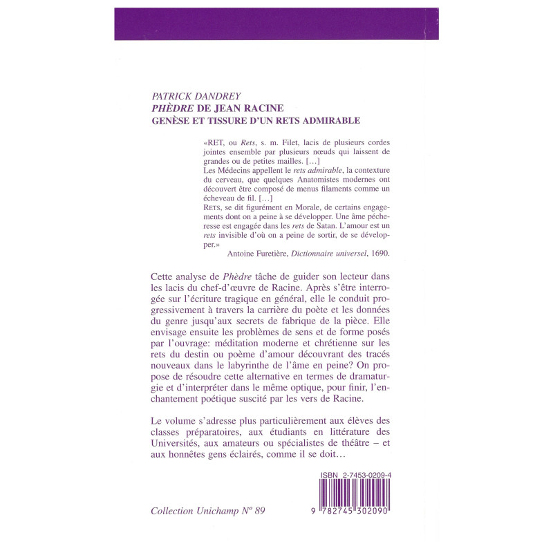 Cette analyse de Phèdre tâche de guider son lecteur dans les lacis du chef-d'œuvre de Racine. Après s'être interrogée sur l'écriture tragique en général, elle le conduit progressivement à travers la carrière du poète et les données du genre jusqu'aux secrets de fabrique de la pièce. Elle envisage ensuite les problèmes de sens et de forme posés par l'ouvrage : méditation moderne et chrétienne sur les rets du destin ou poème d'amour découvrant des tracés nouveaux dans le labyrinthe de l'âme en peine ? On propose de résoudre cette alternative en termes de dramaturgie et d'interpréter dans le même optique, pour finir, l'enchantement poétique suscité par les vers de Racine.