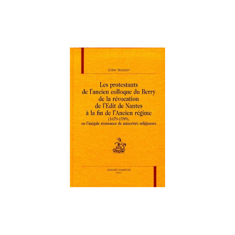 Cet ouvrage se propose d'étudier les protestants de l'ancien colloque du Berry de la Révocation de l'édit de Nantes à la fin de l'Ancien Régime. Les huguenots de cette région sont minoritaires et très dispersés dans des communautés qui couvrent la Marche (Aubusson), le Bas-Berry (Argenton-sur-Creuse et Issoudun), le Haut-Berry (Blet, Asnières-les-Bourges et Henrichemont), le Nivernais et le Morvan (Corbigny et Château-Chinon), le Gâtinais (Châtillon-Coligny) et surtout le Val de Loire (La Charité-sur-Loire, Sancerre, Châtillon-sur-Loire et Gien). Dans les années qui précèdent la Révocation, de nombreux protestants résistent aux persécutions. Mais la répression continue après 1685 et s'abat sur les Nouveaux Convertis jusqu'à la veille de la Révolution. Les intendants de Bourges et d'Orléans, qui appliquent la politique royale et le clergé catholique, qui recherche la conversion sincère des protestants, sont les principaux acteurs des persécutions. Des huguenots préfèrent fuir leur ville d'origine, certains rejoignent l'étranger et d'autres se dispersent dans le royaume, en particulier dans des villes comme Orléans et surtout Paris. Au cours du XVIIIe siècle, si la plupart des communautés protestantes disparaissent, trois réussissent à se maintenir : Sancerre, Châtillon-sur-Loire et Asnières-les-Bourges. Le culte réformé continue là où le calvinisme s'est ancré parmi les éléments populaires, vignerons et artisans. Et quand l'édit de 1787 est promulgué, la tolérance n'est pas encore admise par toute la population du Berry.