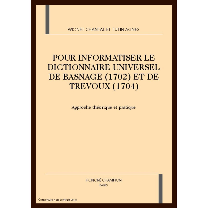 L'ouvrage détaille les conditions de possibilité d'une infor-mati-sa-tion fine et moderne d'un dictionnaire du début du XVIIIe siècle, le Dictionnaire Universel de Basnage de Bauval (1701). Les auteurs ont choisi de recourir à des outils qui jusqu'alors n'ont jamais été utilisés pour le traitement informatique des textes anciens: langage de balisage SGML, adaptation des recommandations proposées par la "Text Encoding Initiative". L'expérimentation a été rendue possible par deux subventions allouées par la Délégation à la Langue Française et l'Institut National de la Langue Française.