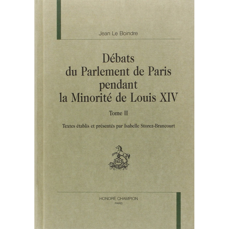 Avec une conscience professionnelle digne de la représentation que ce grand corps se faisait de lui-même, Jean Le Boindre poursuit, de décembre 1650 à la fin de 1652, ses Débats du Parlement de Paris pendant la Minorité de Louis XIV, véritable et stupéfiante " sténotypie " des séances de la cour. M. Orest Ranum en a relevé déjà , pour le premier volume, l'originalité : celle du discours " en direct " de la haute magistrature, la vérité d'un authentique débat de pensée. Le style n'en est ni académique ni fluide, rares sont les sources aussi riches de vérité et d'effets. C'est l'œuvre d'un conseiller, modeste mais attentif, qui devait passer son temps à griffonner sur des papiers les propos de ses collègues. Agir sur les événements par ses paroles ne lui a sans doute paru ni possible ni décent : il ne fut pas un " ténor " du parlement, mais, en sourdine, sa voix est parvenue jusqu'à nous pour amplifier celle des autres parlementaires.
