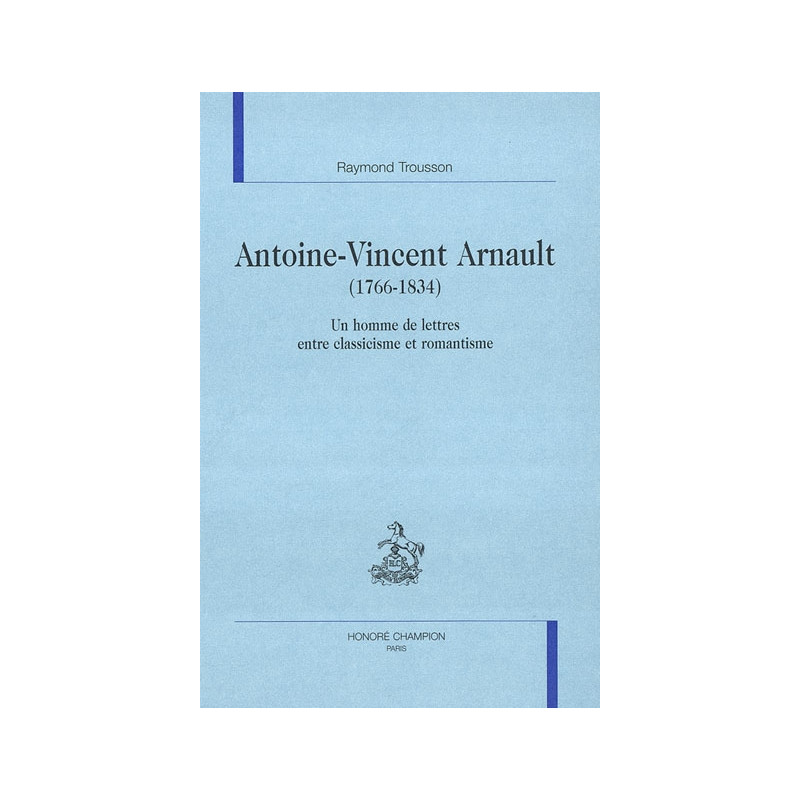 Antoine-Vincent Arnault a connu jusqu'au milieu du XIXe siècle une enviable notoriété. Dès 1791, à vingt cinq ans, il est l'auteur acclamé de Marius à Minturnes, l'une des tragédies les plus réputées de l'époque révolutionnaire. Compagnon de Bonaparte à l'armée d'Italie, un moment chargé par le général de l'organisation du gouvernement des îles Ioniennes, familier de tous les auteurs, acteurs, musiciens de son temps, ami intime de Méhul et de Talma, qui interprétera la plupart de ses pièces, fonctionnaire de l'Empire, rallié à Napoléon pendant les Cent-Jours, exilé par Louis XVIII, responsable de ce Germanicus qui, en 1817, provoque un affrontement violent entre royalistes et bonapartistes, il est aussi le " Juvénal fabuliste " salué par Eugène Scribe qui lui succéda à l'Académie et l'auteur des Souvenirs d'un sexagénaire admirés de Sainte Beuve. Arnault fait partie des littérateurs d'entre-deux longtemps négligés par l'histoire littéraire. Cet adversaire acharné du romantisme a connu pourtant, dans Don Pèdre, Oscar, Les Vénitiens ou Le Proscrit, un penchant pour Shakespeare, réprimé lorsqu'il en perçoit la néfaste influence sur la tradition française, un autre pour le drame et le mélodrame - à condition qu'ils ne se substituent pas à la tragédie, forme suprême , ici et là le pressentiment fugitif que la législation du génie pourrait bien remplacer un jour le code des règles établies. Il n'était pas inutile de retracer avec quelque détail la longue carrière d'un homme qui représente une transition entre deux siècles, deux esthétiques, deux sociétés. C'est à quoi l'on s'est efforcé ici, en rassemblant nombre de documents inédits et surtout nombre de recensions de ses tragédies.