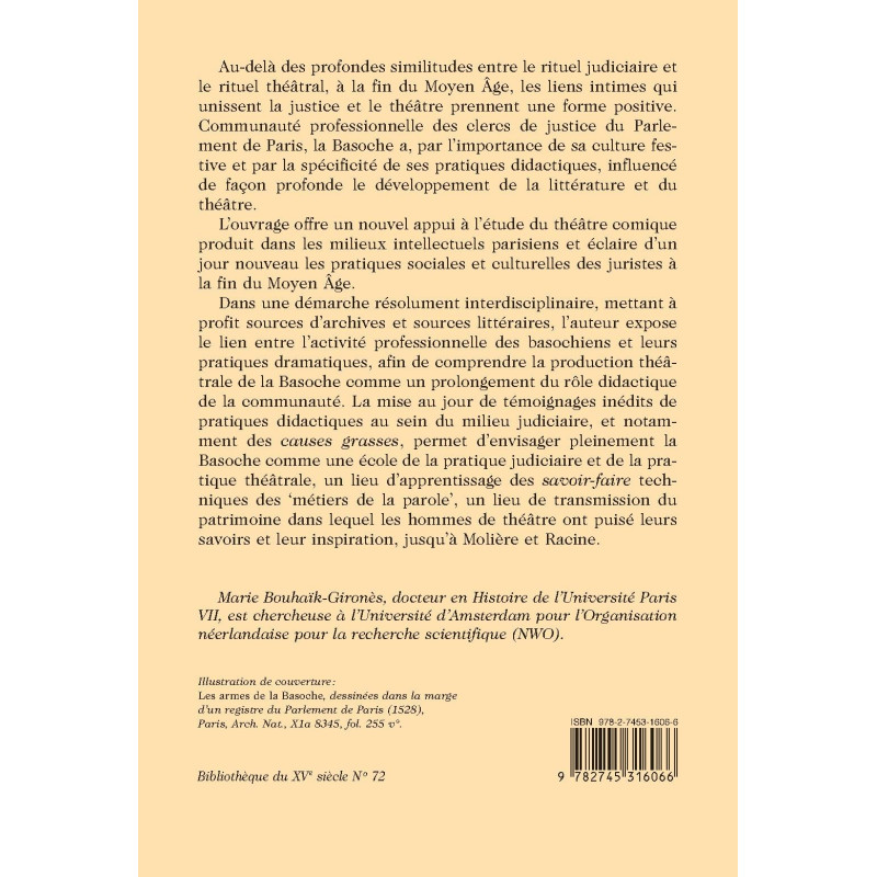 À la fin du Moyen Âge, les liens intimes qui unissent la justice et le théâtre prennent une forme positive. Communauté professionnelle des clercs de justice du Parlement de Paris, la Basoche a, par l`importance de sa culture festive et par la spécificité de ses pratiques didactiques, influencé de façon profonde le développement de la littérature et du théâtre. L`ouvrage offre un nouvel appui à l`étude du théâtre comique produit dans les milieux intellectuels parisiens et éclaire d`un jour nouveau les pratiques sociales et culturelles des juristes à la fin du Moyen Âge. Dans une démarche résolument interdisciplinaire, mettant à profit sources d`archives et sources littéraires, l`auteur expose le lien entre l`activité professionnelle des basochiens et leurs pratiques dramatiques, et permet ainsi d`envisager pleinement la Basoche comme un lieu d`apprentissage des savoir-faire techniques des `métiers de la parole`, un lieu de transmission du patrimoine dans lequel les hommes de théâtre ont puisé leurs savoirs et leur inspiration, jusqu`à Molière et Racine.
