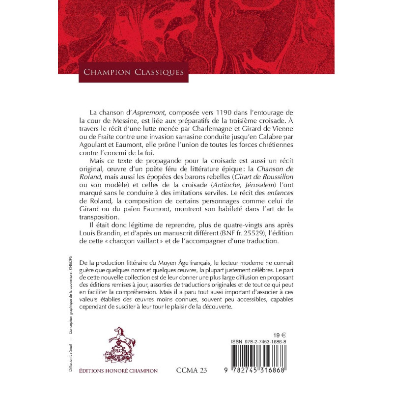 La chanson d'Aspremont, composée vers 1190 dans l'entourage de la cour de Messine, est liée aux préparatifs de la troisième croisade. À travers le récit d'une lutte menée par Charlemagne et Girard de Vienne ou de Fraite contre une invasion sarrasine conduite jusqu'en Calabre par Agoulant et Eaumont, elle prône l'union de toutes les forces chrétiennes contre l'ennemi de la foi. Mais ce texte de propagande pour la croisade est aussi un récit original, œuvre d'un poète féru de littérature épique : la Chanson de Roland, mais aussi les épopées des barons rebelles (Girart de Roussillon ou son modèle) et celles de la croisade (Antioche, Jérusalem) l'ont marqué sans le conduire à des imitations serviles. Le récit des enfances de Roland, la composition de certains personnages comme celui de Girard ou du païen Eaumont, montrent son habileté dans l'art de la transposition. Il était donc légitime de reprendre, plus de quatre-vingts ans après Louis Brandin, et d'après un manuscrit différent (BNF fr. 25529), l'édition de cette " chançon vaillant " et de l'accompagner d'une traduction.