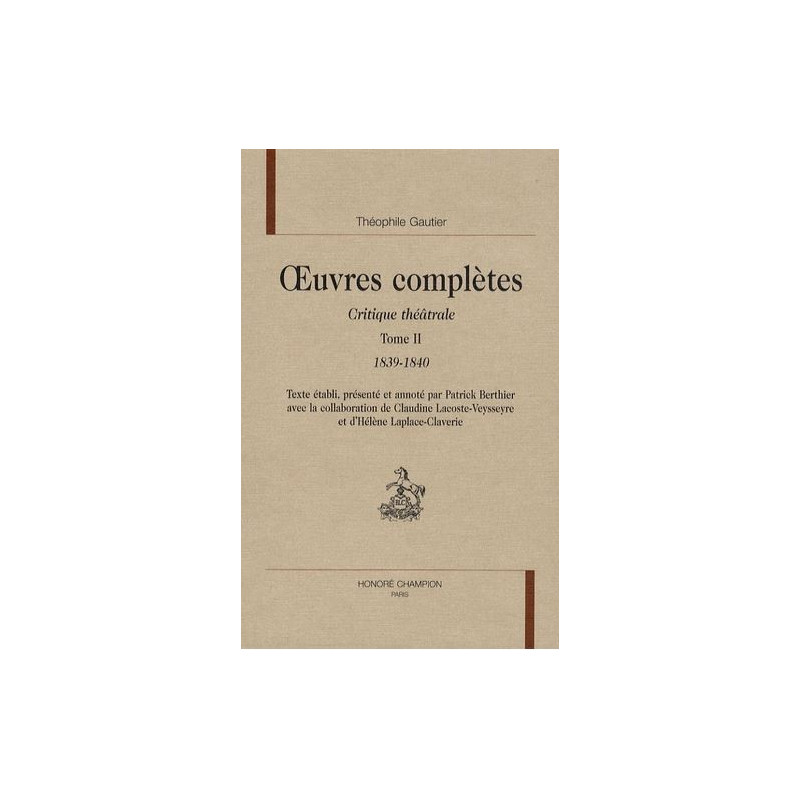 Dans le cadre de l’édition des Œuvres complètes de Théophile Gautier la publication de l’ensemble de la Critique théâtrale de cet auteur revêt une importance particulière. En effet, jamais n’avait paru en librairie le texte intégral du feuilleton dramatique tenu chaque semaine par Gautier de 1837 à 1872 : jusqu’en 1855, il en existait une édition partielle, mutilée et incohérente, et à partir de 1855 les feuilletons n’ont jamais été édités. On trouvera ici, comme pour le tome I (1835-1838) publié en 2007, le texte complet, rétabli avec soin et annoté de manière à rendre accessible dans le détail cet exceptionnel témoignage concret sur l’histoire du spectacle vivant au XIXe siècle.