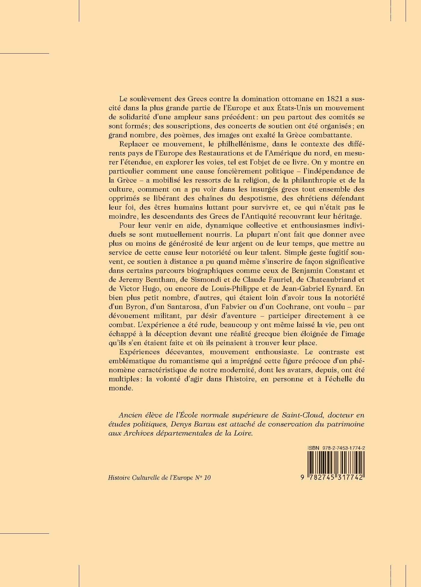 Le mouvement philhellène, qui s'est développé en Europe et aux États Unis pour soutenir la lutte des Grecs pour leur indépendance entre 1821 et 1829, a été sans précédent. Si son ressort est politique, il a aussi des aspects religieux, philanthropiques et culturels. Le présent ouvrage analyse la dynamique d'ensemble du mouvement et la diversité de ses formes. Les plus nombreux des philhellènes se sont contentés de donner de leur argent, de leur temps ou de mettre leur notoriété au service de la Cause. Une petite cohorte a voulu, comme Byron, combattre aux côtés des Grecs, s'estimant comptables du destin d'un pays qui n'était pas le leur, au nom de valeurs universelles. Par là le philhellènisme, qui s'inscrit au croisement de deux processus fondamentaux de la modernité, l'émancipation démocratique et l'unification du monde, peut être compris comme le premier grand avatar d'un internationalisme qui a pris depuis de multiples visages.