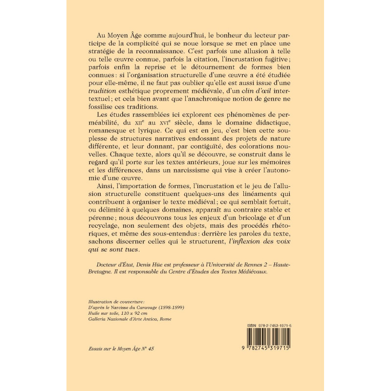Au Moyen Âge comme aujourd`hui, le bonheur du lecteur participe de la complicité qui se noue lorsque se met en place une stratégie de la reconnaissance. C`est parfois une allusion à telle ou telle oeuvre connue, parfois la citation, l`incrustation fugitive; parfois enfin la reprise et le détournement de formes bien connues : si l`organisation structurelle d`une oeuvre a été étudiée pour elle-même, il ne faut pas oublier qu`elle est aussi issue d`une tradition esthétique proprement médiévale, d`un clin d`œil intertextuel ; et cela bien avant que l`anachronique notion de genre ne fossilise ces traditions. Les études rassemblées ici explorent ces phénomènes de perméabilité, du XIIe au XVIe siècles, dans le domaine didactique, romanesque et lyrique. Ce qui est en jeu, c`est bien cette souplesse de structures narratives endossant des projets de nature différente, et leur donnant, par contiguïté, des colorations nouvelles. Chaque texte, alors qu`il se découvre, se construit dans le regard qu`il porte sur les textes antérieurs, joue sur les mémoires et les différences, dans un narcissisme qui vise à créer l`autonomie d`une oeuvre. Ainsi, l`importation de formes, l`incrustation et le jeu de l`allusion structurelle constituent quelques-uns des linéaments qui contribuent à organiser le texte médiéval ; ce qui semblait fortuit, ou délimité à quelques domaines apparaît au contraire stable et pérenne ; nous découvrons tous les enjeux d`un bricolage et d`un recyclage, non seulement des objets, mais des procédés rhétoriques, et même des sous-entendus : derrière les paroles du texte, sachons discerner celles qui le structurent, l`inflexion des voix qui se sont tues.