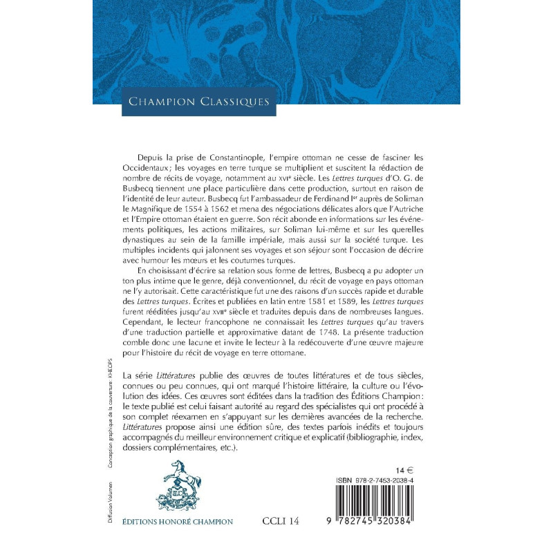 Depuis la prise de Constantinople, l'empire ottoman ne cesse de fasciner les Occidentaux; les voyages en terre turque se multiplient et suscitent la rédaction de nombre de récits de voyage, notamment au XVIe siècle. Les Lettres turques d'O. G. de Busbecq tiennent une place particulière dans cette production, surtout en raison de l'identité de leur auteur. Busbecq fut l'ambassadeur de Ferdinand Ier auprès de Soliman le Magnifique de 1554 à 1562 et mena des négociations délicates alors que l'Autriche et l'Empire ottoman étaient en guerre. Son récit abonde en informations sur les événements politiques, les actions militaires, sur Soliman lui-même et sur les querelles dynastiques au sein de la famille impériale, mais aussi sur la société turque. Les multiples incidents qui jalonnent ses voyages et son séjour sont l'occasion de décrire avec humour les mœurs et les coutumes turques. En choisissant d'écrire sa relation sous forme de lettres, Busbecq a pu adopter un ton plus intime que le genre, déjà conventionnel, du récit de voyage en pays ottoman ne l'y autorisait. Cette caractéristique fut une des raisons d'un succès rapide et durable des Lettres turques. Écrites et publiées en latin entre 1581 et 1589, Les Lettres turques furent rééditées jusqu'au XVIIe siècle et traduites depuis dans de nombreuses langues. Cependant, le lecteur francophone ne connaissait Les Lettres turques qu'au travers d'une traduction partielle et approximative datant de 1748. La présente traduction comble donc une lacune et invite le lecteur à la redécouverte d'une œuvre majeure pour l'histoire du récit de voyage en terre ottomane.