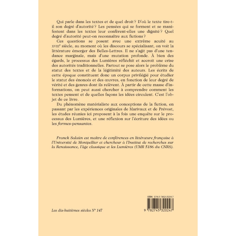 Qui parle dans les textes et de quel droit ? D`où le texte tire-t-il son degré d`autorité ? Les pensées qui se forment et se manifestent dans les textes leur confèrent-elles une dignité ? Quel degré d`autorité peut-on reconnaître aux fictions ? Ces questions se posent avec une extrême acuité au XVIIIe siècle, au moment où les discours se spécialisant, on voit la littérature émerger des Belles-Lettres. Il ne s`agit pas d`une tendance marginale, mais d`une mutation profonde. À bien des égards, le processus des Lumières réfléchit et accroit une crise des autorités traditionnelles. Partout se pose alors le problème du statut des textes et de la légitimité des auteurs. Les écrits de cette époque constituent donc un corpus privilégié pour étudier le statut des énoncés et des œuvres, en fonction de leur degré de vérité et des genres dont ils relèvent. À partir de cette masse d`informations, on peut aussi chercher à comprendre comment les textes pensent et de quelles façons les idées circulent. C`est l`objet de ce livre. Du phénomène matérialiste aux conceptions de la fiction, en passant par les expériences originales de Marivaux et de Prévost, les études réunies ici proposent à la fois une enquête sur le processus des Lumières, et une réflexion sur l`écriture des idées ou les formes-pensantes. Franck Salaün est maître de conférences en littérature française à l`Université de Montpellier et chercheur à l`Institut de recherches sur la Renaissance, l`âge classique et les Lumières (UMR 5186 du CNRS).