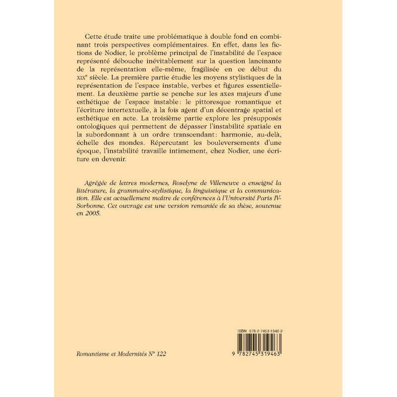 Cette étude traite une problématique à double fond en combinant trois perspectives complémentaires. En effet, dans les fictions de Nodier, le problème principal de l'instabilité de l'espace représenté débouche inévitablement sur la question lancinante de la représentation elle-même, fragilisée en ce début du XIXe siècle. La première partie étudie les moyens stylistiques de la représentation de l'espace instable, verbes et figures essentiellement. La deuxième partie se penche sur les axes majeurs d'une esthétique de l'espace instable : le pittoresque romantique et l'écriture intertextuelle, à la fois agent d'un décentrage spatial et esthétique en acte. La troisième partie explore les présupposés ontologiques qui permettent de dépasser l'instabilité spatiale en la subordonnant à un ordre transcendant : harmonie, au-delà , échelle des mondes. Répercutant les bouleversements d'une époque, l'instabilité travaille intimement, chez Nodier, une écriture en devenir. Agrégée de lettres modernes, Roselyne de Villeneuve a enseigné la littérature, la grammaire-stylistique, la linguistique et la communication. Elle est actuellement maître de conférences à l'Université Paris IV Sorbonne. Cet ouvrage est une version remaniée de sa thèse, soutenue en 2005.