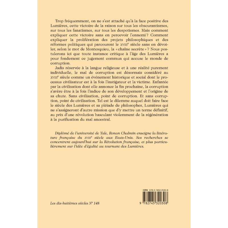 Trop fréquemment, on ne s'est attaché qu'à la face positive des Lumières, cette victoire de la raison sur tous les obscurantismes, sur tous les fanatismes, sur tous les despotismes. Mais comment expliquer cette victoire sans en percevoir l'ennemi? Comment expliquer la prolifération des projets philosophiques et des réformes politiques qui parcourent le XVIIIe siècle sans en dévoiler, selon le mot de Montesquieu, la " chaîne secrète " ? Nous postulerons ici que toute instance critique à l'âge des Lumières a pour fondement ce jugement commun qui accuse le monde de corruption. Jadis réservée à la langue religieuse et à une réalité purement individuelle, le mal de corruption est désormais considéré au XVIIIe siècle comme un événement historique et social dont le processus civilisateur est à la fois l'instigateur et la victime. Enfantée par la civilisation dont elle annonce la fin prochaine, la corruption s'avère être à la fois l'indice de son développement et l'origine de sa chute. Sans civilisation, point de corruption. Et sans corruption, point de civilisation. Tel est le dilemme auquel doit faire face le siècle des Lumières et sa pléiade de philosophes, Lumières qui ne s'assigneront d'autre mission que d'y mettre un terme définitif, au prix d'une révolution basculant violemment de la régénération à la purification du mal ancestral.