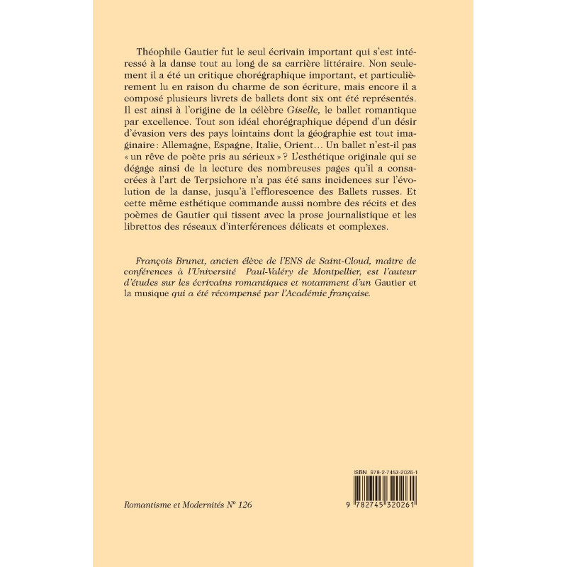 Théophile Gautier fut le seul écrivain important qui s'est intéressé à la danse tout au long de sa carrière littéraire. Non seulement il a été un critique chorégraphique important, et particulièrement lu en raison du charme de son écriture, mais encore il a composé plusieurs livrets de ballets dont six ont été représentés. Il est ainsi à l'origine de la célèbre Giselle, le ballet romantique par excellence. Tout son idéal chorégraphique dépend d'un désir d'évasion vers des pays lointains dont la géographie est tout imaginaire : Allemagne, Espagne, Italie, Orient… Un ballet n'est-il pas " un rêve de poète pris au sérieux "? L'esthétique originale qui se dégage ainsi de la lecture des nombreuses pages qu'il a consacrées à l'art de Terpsichore n'a pas été sans incidences sur l'évolution de la danse, jusqu'à l'efflorescence des Ballets russes. Et cette même esthétique commande aussi nombre des récits et des poèmes de Gautier qui tissent avec la prose journalistique et les librettos des réseaux d'interférences délicats et complexes.