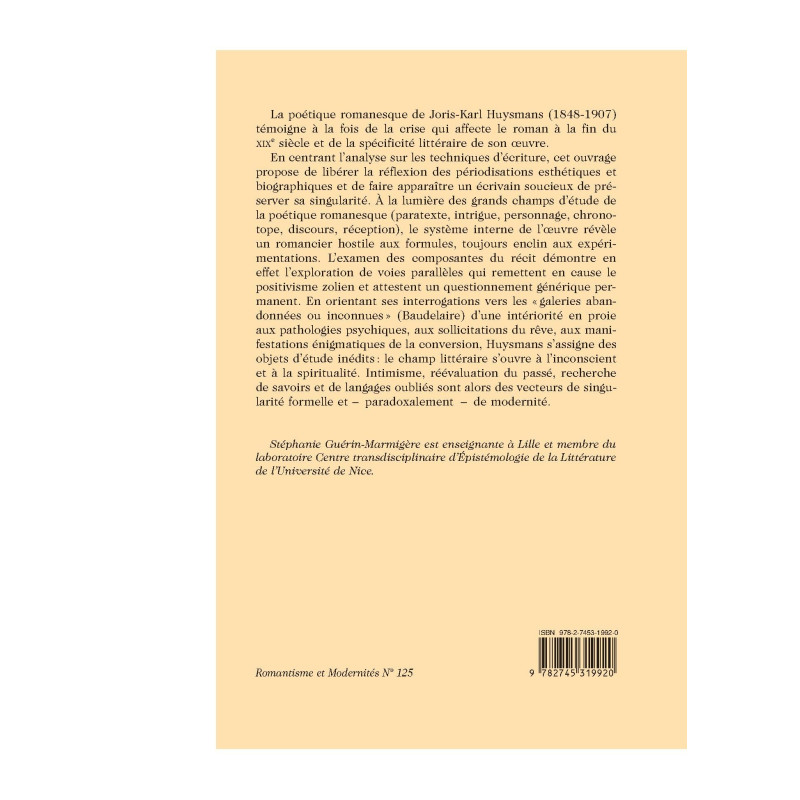 La poétique romanesque de Joris-Karl Huysmans (1848-1907) témoigne à la fois de la crise qui affecte le roman à la fin du XIXe siècle et de la spécificité littéraire de son oeuvre. En centrant l'analyse sur les techniques d'écriture, cet ouvrage propose de libérer la réflexion des périodisations esthétiques et biographiques et de faire apparaître un écrivain soucieux de préserver sa singularité. À la lumière des grands champs d'étude de la poétique romanesque (paratexte, intrigue, personnage, chronotope, discours, réception), le système interne de l'oeuvre révèle un romancier hostile aux formules, toujours enclin aux expérimentations. L'examen des composantes du récit démontre en effet l'exploration de voies parallèles qui remettent en cause le positivisme zolien et attestent un questionnement générique permanent. En orientant ses interrogations vers les " galeries abandonnées ou inconnues " (Baudelaire) d'une intériorité en proie aux pathologies psychiques, aux sollicitations du rêve, aux manifestations énigmatiques de la conversion, Huysmans s'assigne des objets d'étude inédits : le champ littéraire s'ouvre à l'inconscient et à la spiritualité. Intimisme, réévaluation du passé, recherche de savoirs et de langages oubliés sont alors des vecteurs de singularité formelle et - paradoxalement - de modernité. Stéphanie Guérin-Marmigère est enseignante à Lille et membre du laboratoire Centre transdisciplinaire d'Épistémologie de la Littérature de l'Université de Nice.