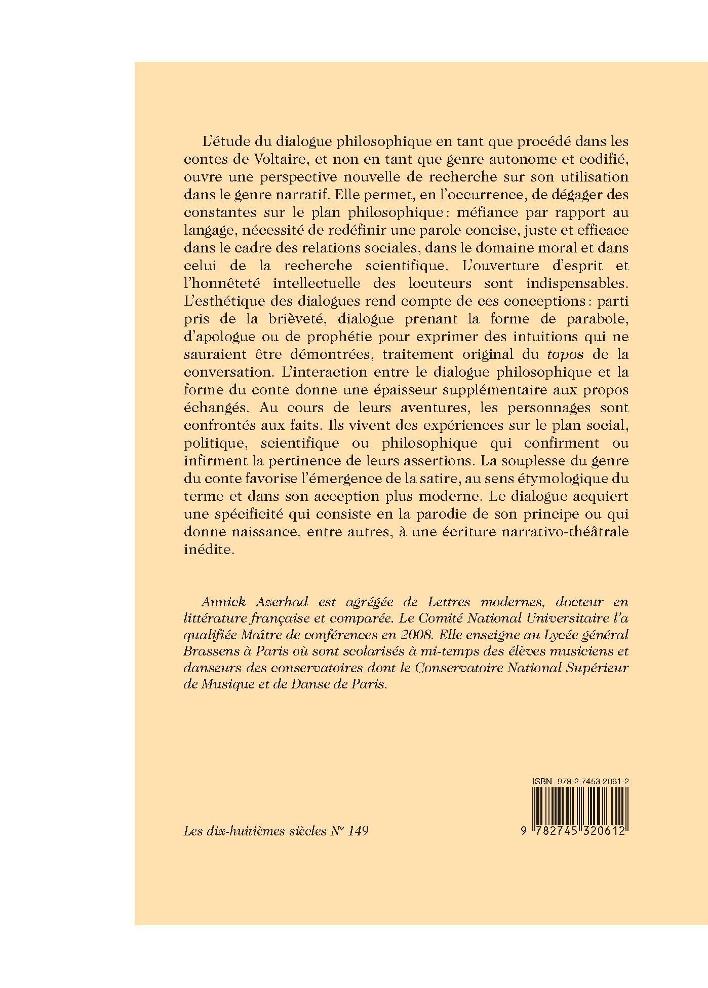 L'étude du dialogue philosophique en tant que procédé dans les contes de Voltaire, et non en tant que genre autonome et codifié, ouvre une perspective nouvelle de recherche sur son utilisation dans le genre narratif. Elle permet, en l'occurrence, de dégager des constantes sur le plan philosophique : méfiance par rapport au langage, nécessité de redéfinir une parole concise, juste et efficace dans le cadre des relations sociales, dans le domaine moral et dans celui de la recherche scientifique. L'ouverture d'esprit et l'honnêteté intellectuelle des locuteurs sont indispensables. L'esthétique des dialogues rend compte de ces conceptions : parti pris de la brièveté, dialogue prenant la forme de parabole, d'apologue ou de prophétie pour exprimer des intuitions qui ne sauraient être démontrées, traitement original du topos de la conversation. L'interaction entre le dialogue philosophique et la forme du conte donne une épaisseur supplémentaire aux propos échangés. Au cours de leurs aventures, les personnages sont confrontés aux faits. Ils vivent des expériences sur le plan social, politique, scientifique ou philosophique qui confirment ou infirment la pertinence de leurs assertions. La souplesse du genre du conte favorise l'émergence de la satire, au sens étymologique du terme et dans son acception plus moderne. Le dialogue acquiert une spécificité qui consiste en la parodie de son principe ou qui donne naissance, entre autres, à une écriture narrativo-théâtrale inédite.