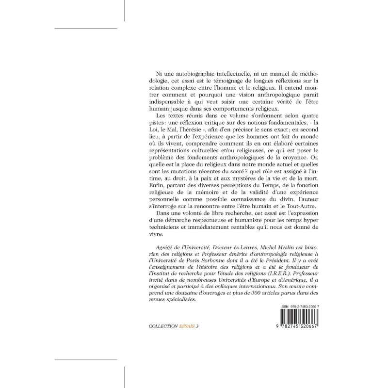 Ni une autobiographie intellectuelle, ni un manuel de méthodologie, cet essai est le témoignage de longues réflexions sur la relation complexe entre l'homme et le religieux. Il entend montrer comment et pourquoi une vision anthropologique paraît indispensable à qui veut saisir une certaine vérité de l'être humain jusque dans ses comportements religieux. Les textes réunis dans ce volume s'ordonnent selon quatre pistes: une réflexion critique sur des notions fondamentales, - la Loi, le Mal, l'hérésie -, afin d'en préciser le sens exact; en second lieu, à partir de l'expérience que les hommes ont fait du monde où ils vivent, comprendre comment ils en ont élaboré certaines représentations culturelles et/ou religieuses, ce qui est poser le problème des fondements anthropologiques de la croyance. Or, quelle est la place du religieux dans notre monde actuel et quelles sont les mutations récentes du sacré? quel rôle est assigné à l'intime, au droit, à la paix et aux mystères de la vie et de la mort. Enfin, partant des diverses perceptions du Temps, de la fonction religieuse de la mémoire et de la validité d'une expérience personnelle comme possible connaissance du divin, l'auteur s'interroge sur la rencontre entre l'être humain et le Tout-Autre. Dans une volonté de libre recherche, cet essai est l'expression d'une démarche respectueuse et humaniste pour les temps hyper techniciens et immédiatement rentables qu'il nous est donné de vivre.