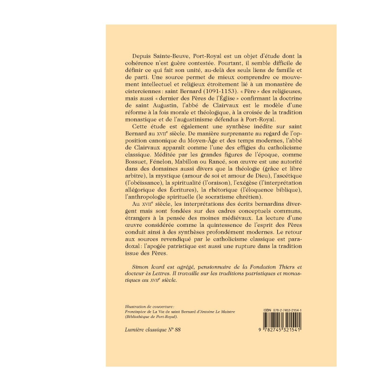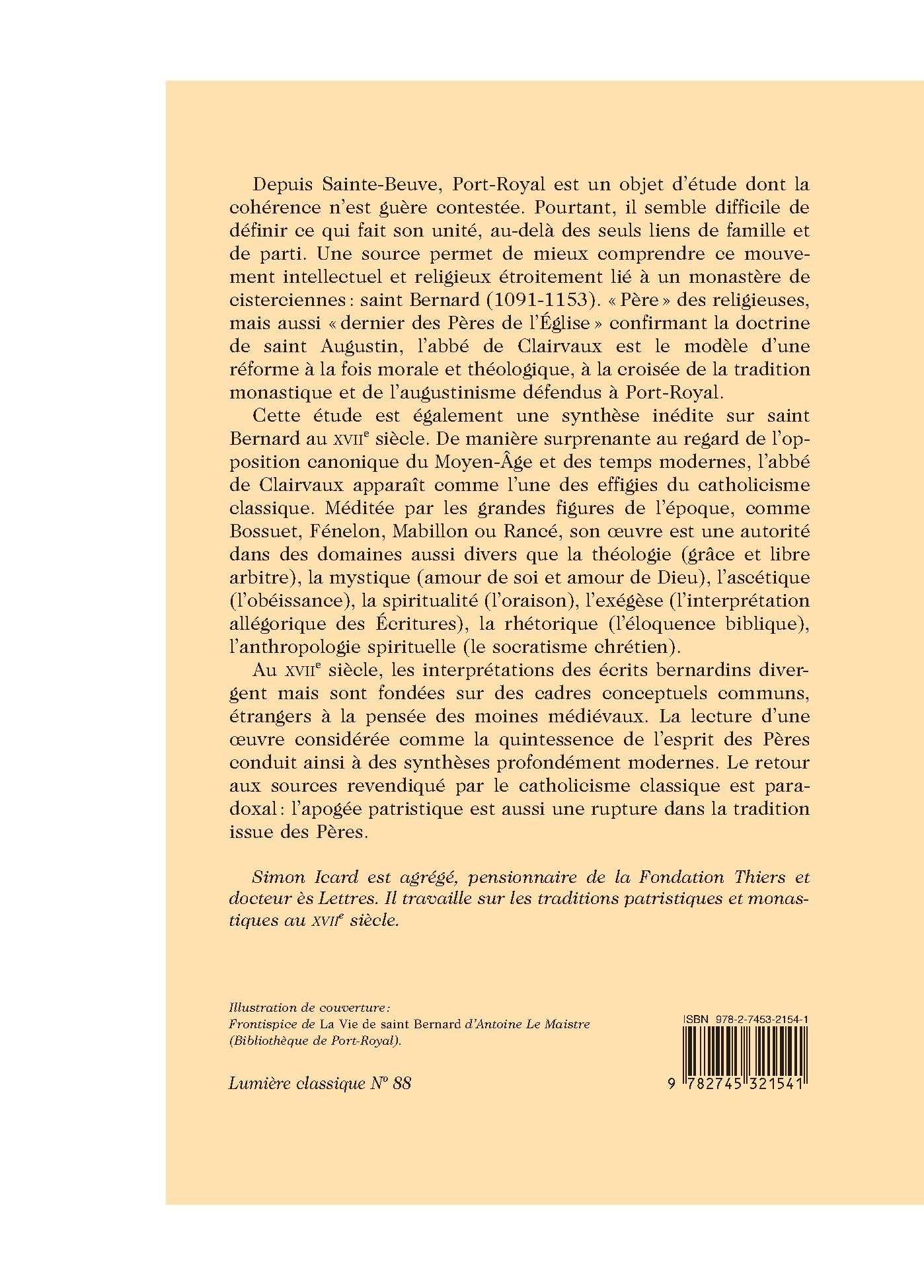 Depuis Sainte-Beuve, Port-Royal est un objet d`étude dont la cohérence n`est guère contestée. Pourtant, il semble difficile de définir ce qui fait son unité, au-delà des seuls liens de famille et de parti. Une source permet de mieux comprendre ce mouvement intellectuel et religieux étroitement lié à un monastère de cisterciennes : saint Bernard (1091-1153). " Père " des religieuses, mais aussi "dernier des Pères de l`Église " confirmant la doctrine de saint Augustin, l`abbé de Clairvaux est le modèle d`une réforme à la fois morale et théologique, à la croisée de la tradition monastique et de l`augustinisme défendus à Port-Royal. Cette étude est également une synthèse inédite sur saint Bernard au XVIIe siècle. De manière surprenante au regard de l`opposition canonique du Moyen-Âge et des temps modernes, l`abbé de Clairvaux apparaît comme l`une des effigies du catholicisme classique. Méditée par les grandes figures de l`époque, comme Bossuet, Fénelon, Mabillon ou Rancé, son œuvre est une autorité dans des domaines aussi divers que la théologie (grâce et libre arbitre), la mystique (amour de soi et amour de Dieu), l`ascétique (l`obéissance), la spiritualité (l`oraison), l`exégèse (l`interprétation allégorique des Écritures), la rhétorique (l`éloquence biblique), l`anthropologie spirituelle (le socratisme chrétien). Au XVIIe siècle, les interprétations des écrits bernardins divergent mais sont fondées sur des cadres conceptuels communs, étrangers à la pensée des moines médiévaux. La lecture d`une œuvre considérée comme la quintessence de l`esprit des Pères conduit ainsi à des synthèses profondément modernes. Le retour aux sources revendiqué par le catholicisme classique est paradoxal : l`apogée patristique est aussi une rupture dans la tradition issue des Pères. Simon Icard est agrégé, pensionnaire de la Fondation Thiers et docteur ès Lettres. Il travaille sur les traditions patristiques et monastiques au XVIIe siècle.