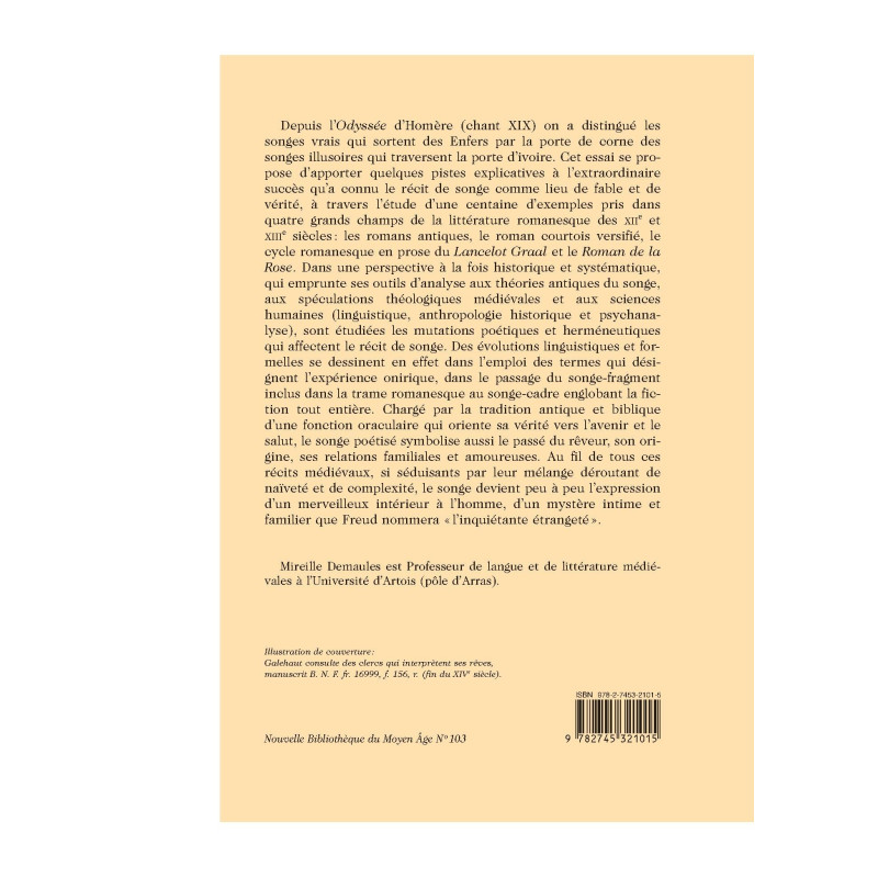 Depuis l`Odyssée d`Homère (chant XIX) on a distingué les songes vrais qui sortent des Enfers par la porte de corne des songes illusoires qui traversent la porte d`ivoire. Cet essai se propose d`apporter quelques pistes explicatives à l`extraordinaire succès qu`a connu le récit de songe comme lieu de fable et de vérité, à travers l`étude d`une centaine d`exemples pris dans quatre grands champs de la littérature romanesque des XIIe et XIIIe siècles : les romans antiques, le roman courtois versifié, le cycle romanesque en prose du Lancelot Graal et le Roman de la Rose. Dans une perspective à la fois historique et systématique, qui emprunte ses outils d`analyse aux théories antiques du songe, aux spéculations théologiques médiévales et aux sciences humaines (linguistique, anthropologie historique et psychanalyse), sont étudiées les mutations poétiques et herméneutiques qui affectent le récit de songe. Des évolutions linguistiques et formelles se dessinent en effet dans l`emploi des termes qui désignent l`expérience onirique, dans le passage du songe-fragment inclus dans la trame romanesque au songecadre englobant la fiction tout entière. Chargé par la tradition antique et biblique d`une fonction oraculaire qui oriente sa vérité vers l`avenir et le salut, le songe poétisé symbolise aussi le passé du rêveur, son origine, ses relations familiales et amoureuses. Au fil de tous ces récits médiévaux, si séduisants par leur mélange déroutant de naïveté et de complexité, le songe devient peu à peu l`expression d`un merveilleux intérieur à l`homme, d`un mystère intime et familier que Freud nommera " l`inquiétante étrangeté ".