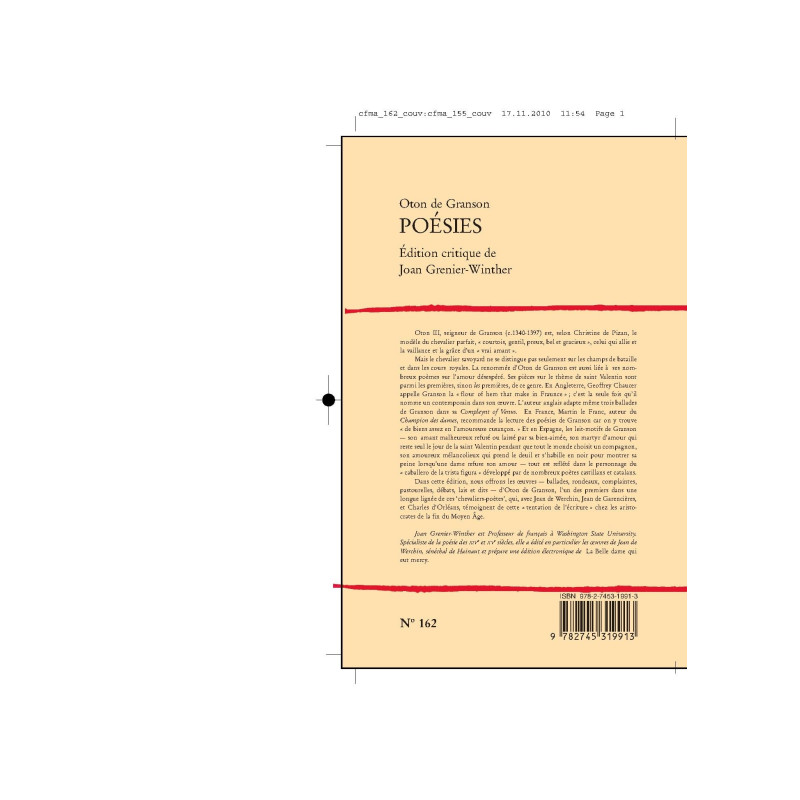 Dans cette édition, nous offrons les œuvres – ballades, rondeaux, complaintes, pastourelles, débats, lais et dits – d’Oton de Granson, l’un des premiers dans une longue lignée de ces « chevaliers-poètes », qui, avec Jean de Werchin, Jean de Garencières, et Charles d’Orléans, témoignent de cette « tentation de l’écriture » chez les aristocrates de la fin du Moyen Âge.
