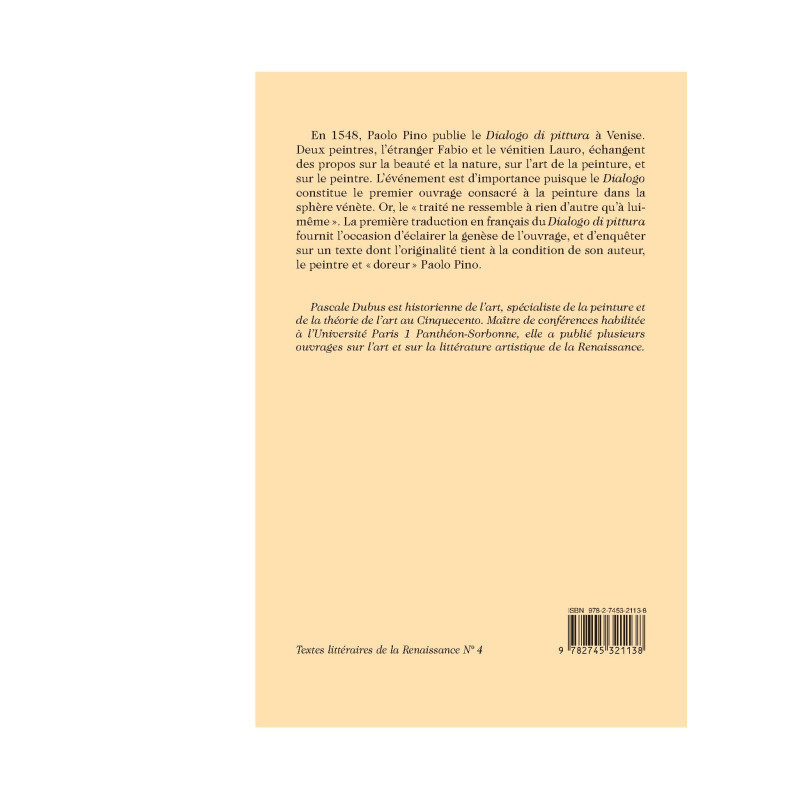 En 1548, Paolo Pino publie le Dialogo di pittura à Venise. Deux peintres, l’étranger Fabio et le vénitien Lauro, échangent des propos sur la beauté et la nature, sur l’art de la peinture, et sur le peintre. L’événement est d’importance puisque le Dialogo constitue le premier ouvrage consacré à la peinture dans la sphère vénète. Or, le « traité ne ressemble à rien d’autre qu’à luimême». La première traduction en français du Dialogo di pittura fournit l’occasion d’éclairer la genèse de l’ouvrage, et d’enquêter sur un texte dont l’originalité tient à la condition de son auteur, le peintre et «doreur » Paolo Pino.
