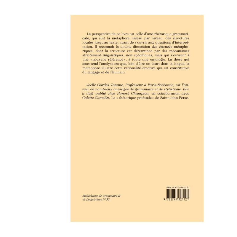 La perspective de ce livre est celle d`une rhétorique grammaticale, qui suit la métaphore niveau par niveau, des structures locales jusqu`au texte, avant de s`ouvrir aux questions d`interprétation. Il reconnaît la double dimension des énoncés métaphoriques, dont la structure est déterminée par des mécanismes strictement linguistiques, non spécifiques, mais qui s`ouvrent à une " nouvelle référence ", à toute une ontologie. La thèse qui sous-tend l`analyse est que, loin d`être un écart dans la langue, la métaphore illustre cette rationalité émotive qui est constitutive du langage et de l`humain. Joëlle Gardes Tamine, Professeur à Paris-Sorbonne, est l`auteur de nombreux ouvrages de grammaire et de stylistique. Elle a déjà publié chez Honoré Champion, en collaboration avec Colette Camelin, La " rhétorique profonde " de Saint-John Perse.