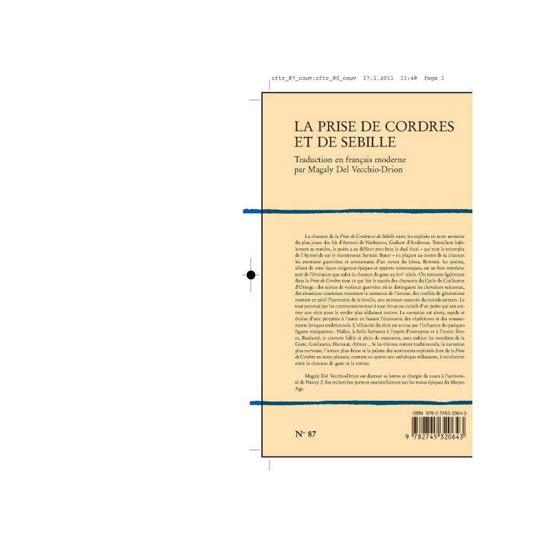 La chanson de la Prise de Cordres et de Sebille narre les exploits en terre sarrasine du plus jeune des fils d`Aymeri de Narbonne, Guibert d`Andrenas. Travaillant habilement sa matière, le poète a su différer avec brio le duel final - qui voit le triomphe de l`Aymeride sur le monstrueux Sarrasin Butor - en plaçant au centre de sa chanson les aventures guerrières et amoureuses d`un neveu du héros, Bertrant. Le poème, alliant de cette façon exigences épiques et apports romanesques, est un bon représentant de l`évolution que subit la chanson de geste au XIIIe siècle. On retrouve également dans la Prise de Cordres tout ce qui fait le succès des chansons du Cycle de Guillaume d`Orange : des scènes de violence guerrière où se distinguent les chevaliers valeureux, des situations courtoises montrant la naissance de l`amour, des conflits de générations mettant en péril l`harmonie de la famille, une peinture nuancée du monde sarrasin. Le tout ponctué par les commentaires tour à tour émus ou incisifs d`un poète qui sait animer son récit pour le rendre plus séduisant encore. La narration est alerte, rapide et évolue d`une péripétie à l`autre en faisant l`économie des répétitions et des ressassements lyriques traditionnels. L`efficacité du récit est accrue par l`influence de quelques figures marquantes : Nubie, la belle Sarrasine à l`esprit d`entreprise et à l`ironie féroce, Baufumé, le converti fidèle et plein de ressources, sans oublier les membres de la Geste, Guillaume, Hernaut, Aer… Si les thèmes restent traditionnels, la narration plus nerveuse, l`action plus dense et la palette des sentiments exploités font de la Prise de Cordres un texte plaisant, mettant en œuvre une esthétique séduisante, à mi-chemin entre la chanson de geste et le roman. Magaly Del Vecchio-Drion est docteur es lettres et chargée de cours à l`université de Nancy 2. Ses recherches portent essentiellement sur les textes épiques du Moyen Age.
