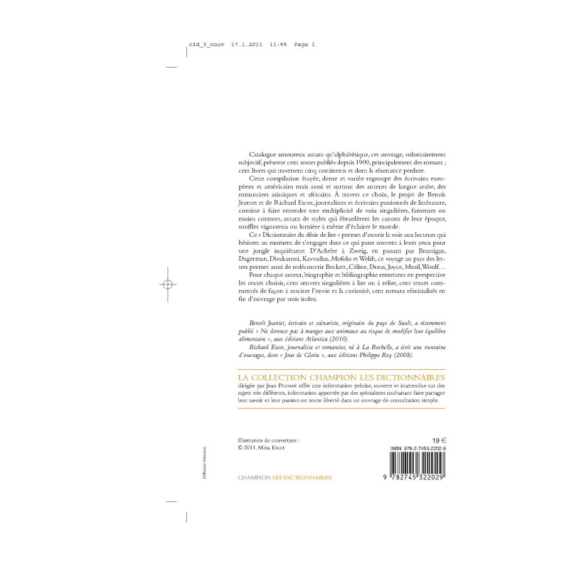 Catalogue amoureux autant qu`alphabétique, cet ouvrage, volontairement subjectif, présente cent textes publiés depuis 1900, principalement des romans ; cent livres qui traversent cinq continents et dont la résonance perdure. Cette compilation étayée, dense et variée regroupe des écrivains européens et américains mais aussi et surtout des auteurs de langue arabe, des romanciers asiatiques et africains. À travers ce choix, le projet de Benoit Jeantet et de Richard Escot, journalistes et écrivains passionnés de littérature, consiste à faire entendre une multiplicité de voix singulières, fameuses ou moins connues, autant de styles qui ébranlèrent les canons de leur époque, souffles vigoureux ou lumière à même d`éclairer le monde. Ce " Dictionnaire du désir de lire " permet d`ouvrir la voie aux lecteurs qui hésitent au moment de s`engager dans ce qui passe souvent à leurs yeux pour une jungle inquiétante. D`Achebe à Zweig, en passant par Brautigan, Dagerman, Divakaruni, Kavvadias, Mofolo et Welsh, ce voyage au pays des lettres permet aussi de redécouvrir Beckett, Céline, Duras, Joyce, Musil, Woolf… Pour chaque auteur, biographie et bibliographie remettent en perspective les textes choisis, cent œuvres singulières à lire ou à relire, cent textes commentés de façon à susciter l`envie et la curiosité, cent romans réinitialisés en fin d`ouvrage par trois index. Benoit Jeantet, écrivain et scénariste, originaire du pays de Sault, a récemment publié " Ne donnez pas à manger aux animaux sous peine de modifier leur équilibre alimentaire ", aux éditions Atlantica (2010). Richard Escot, journaliste et romancier, né à La Rochelle, a écrit une trentaine d`ouvrages, dont " Jour de Gloire ", aux éditions Philippe Rey (2008).