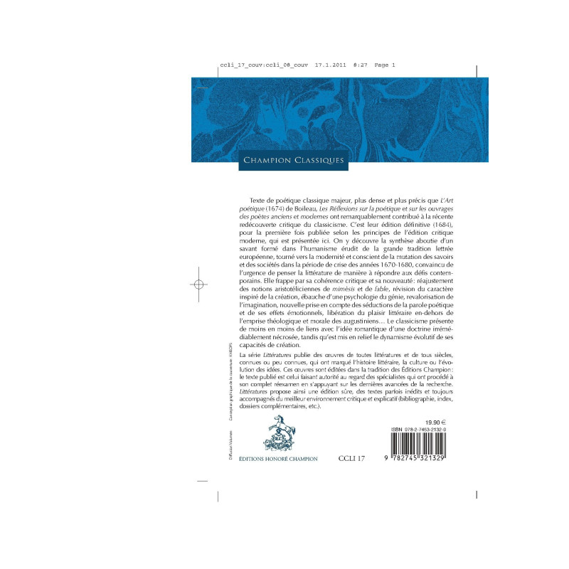 Texte de poétique classique majeur, plus dense et plus précis que L`Art poétique (1674) de Boileau, les Réflexions sur la poétique ont remarquablement contribué à la récente redécouverte critique du classicisme. C`est leur édition définitive (1684), pour la première fois publiée selon les principes de l`édition critique moderne, qui est présentée ici. On y découvre la synthèse aboutie d`un savant formé dans l`humanisme érudit de la grande tradition lettrée européenne, tourné vers la modernité et conscient de la mutation des savoirs et des sociétés dans la période de crise des années1670-1680, convaincu de l`urgence de penser la littérature de manière à répondre aux défis contemporains. Elle frappe par sa cohérence critique et sa nouveauté : réajustement des notions aristotéliciennes de mimèsis et de fable, révision du caractère inspiré de la création, ébauche d`une psychologie du génie, revalorisation de l`imagination, nouvelle prise en compte des séductions de la parole poétique et de ses effets émotionnels, libération du plaisir littéraire en-dehors de l`emprise théologique et morale des augustiniens…Le classicisme présente de moins en moins de liens avec l`idée romantique d`une doctrine irrémédiablement nécrosée, tandis qu`est mis en relief le dynamisme évolutif de ses capacités de création.