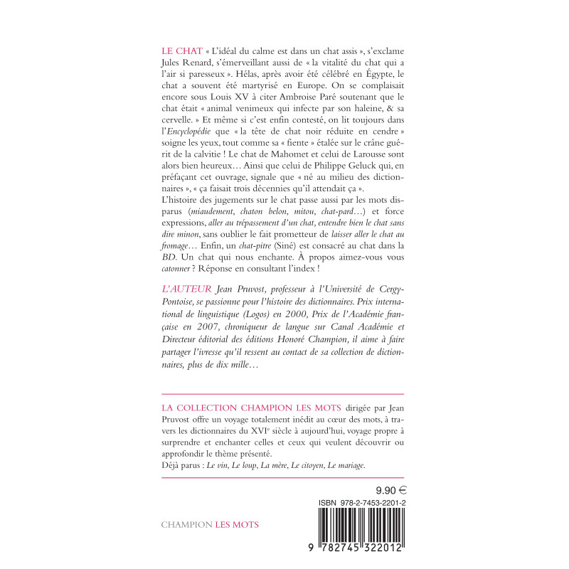 " L`idéal du calme est dans un chat assis ", s`exclame Jules Renard, s`émerveillant aussi de " la vitalité du chat qui a l`air si paresseux ". Hélas, après avoir été célébré en Égypte, le chat a souvent été martyrisé en Europe. On se complaisait encore sous Louis XV à citer Ambroise Paré soutenant que le chat était " animal venimeux qui infecte par son haleine, & sa cervelle. " Et même si c`est enfin contesté, on lit toujours dans l`Encyclopédie que " la tête de chat noir réduite en cendre " soigne les yeux, tout comme sa " fiente " étalée sur le crâne guérit de la calvitie ! Le chat de Mahomet et celui de Larousse sont alors bien heureux… L`histoire des jugements sur le chat passe aussi par les mots disparus (miaudement, chaton belon, mitou, chat-pard…) et force expressions, aller au trépassement d`un chat, entendre bien le chat sans dire minon, sans oublier le fait prometteur de laisser aller le chat au fromage… Enfin, un chat-pitre (Siné) est consacré au chat dans la BD. Un chat qui nous enchante. À propos aimez-vous vous catonner ? Réponse en consultant l`index ! LA COLLECTION CHAMPION LES MOTS dirigée par Jean Pruvost offre un voyage totalement inédit au cœur des mots, à travers les dictionnaires du XVIe siècle à aujourd`hui, voyage propre à surprendre et enchanter celles et ceux qui veulent découvrir ou approfondir le thème présenté. Déjà parus : Le vin, Le loup, La mère, Le citoyen, Le mariage. L`AUTEUR Jean Pruvost, professeur à l`Université de Cergy- Pontoise, se passionne pour l`histoire des dictionnaires. Prix international de linguistique (Logos) en 2000, Prix de l`Académie française en 2007, chroniqueur de langue sur Canal Académie et Directeur éditorial des éditions Honoré Champion, il aime à faire partager l`ivresse qu`il ressent au contact de sa collection de dictionnaires, plus de dix mille…